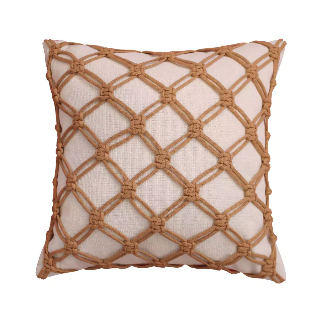 Capa de almofada produzida com cordas de algodão costuradas manualmente. Possui tecido liso na parte de traz e zíper embutido. Textura rústica.