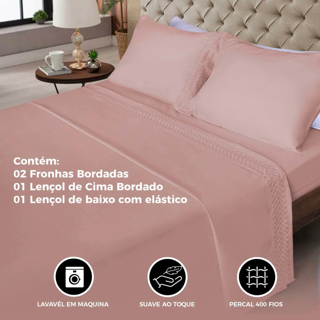 Aposte no Jogo de Lençol Bordado Casal 4 Peças Percal 400 Fios Modelo 2 Rose e eleve o padrão do seu dormitório com beleza, conforto e sofisticação!