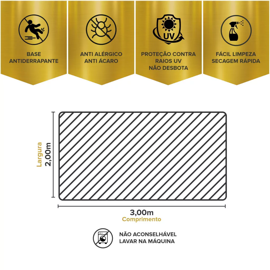 Na parte superior além do design elegante o tapete é feito com material que projeta mais resistência, fazendo com que você tenha um produto mais duradouro e mantendo a praticidade de ser um produto lavável e com secagem rápida.